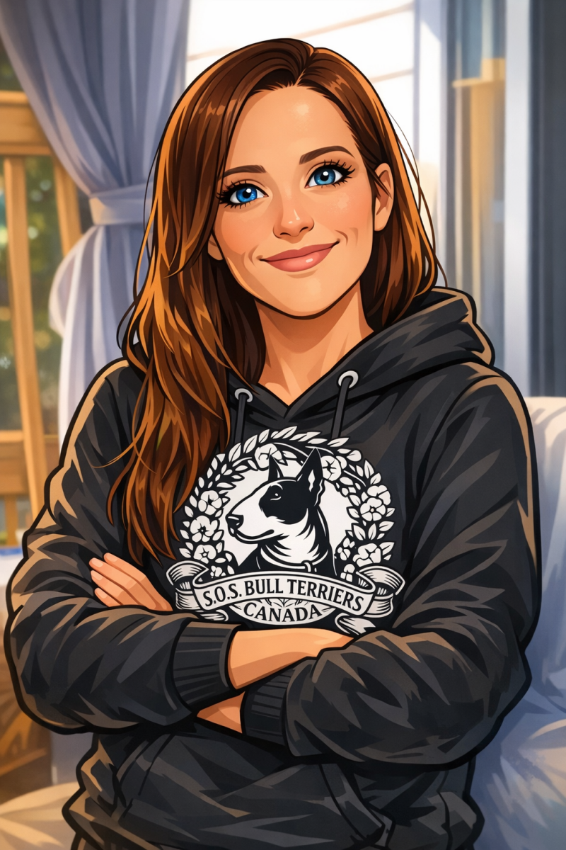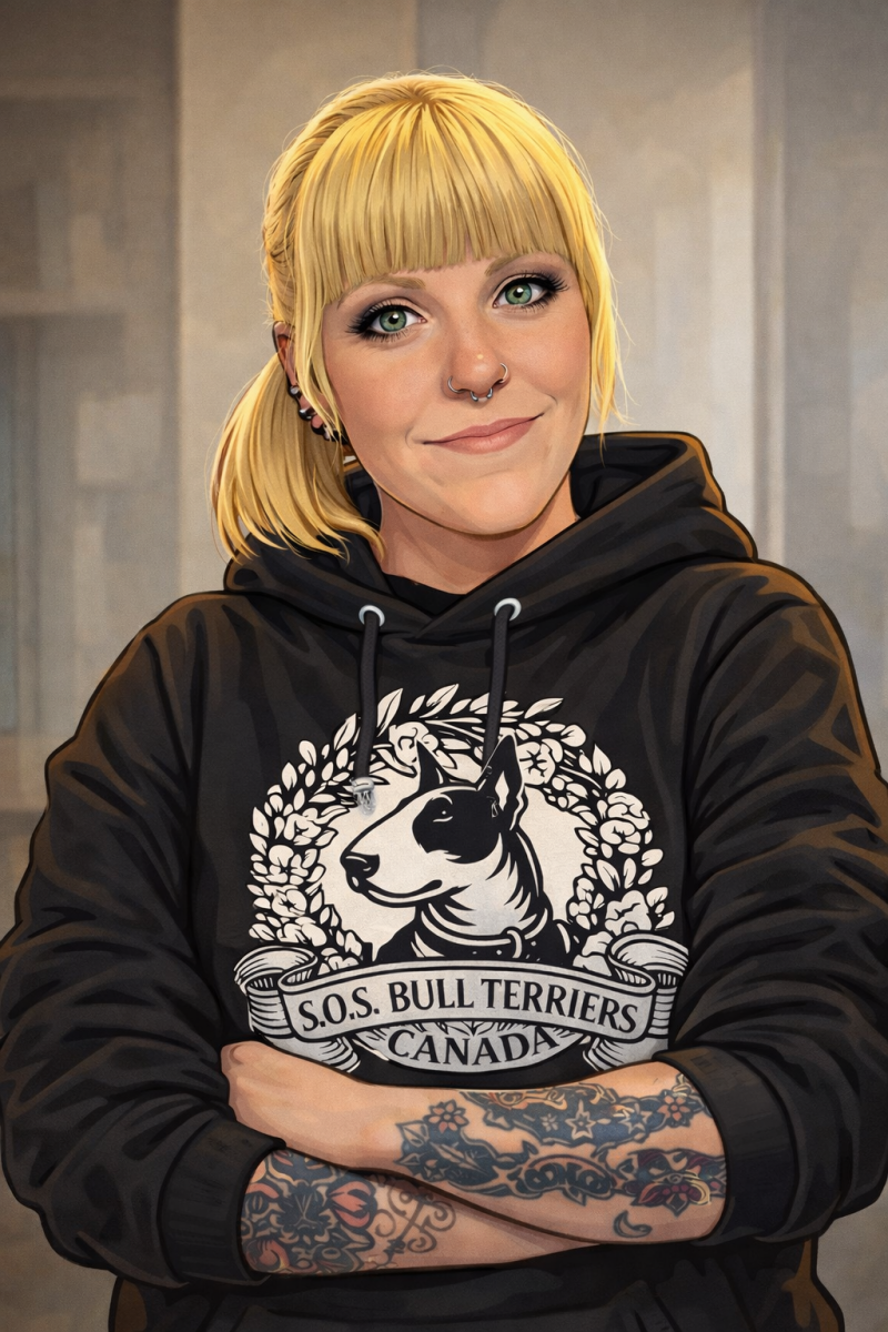 As the founder of SOS Bull Terrier Canada, Kim S. has built much more than a rescue — she has built a true mission. Over the years, she has helped countless dogs find a second chance, always prioritizing thoughtful, responsible placements tailored to each individual dog.